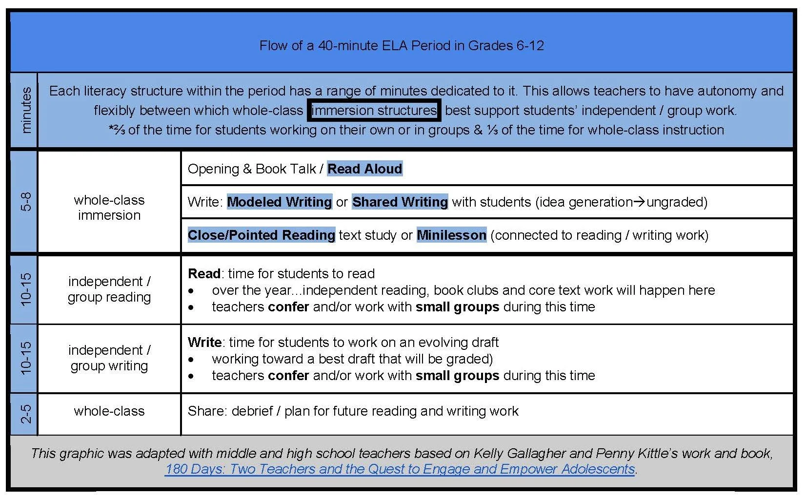 Below is a graphic I have adapted with middle and high school teachers based on Kelly Gallagher and Penny Kittle’s work and book, 180 Days: Two Teachers and the Quest to Engage and Empower Adolescents.