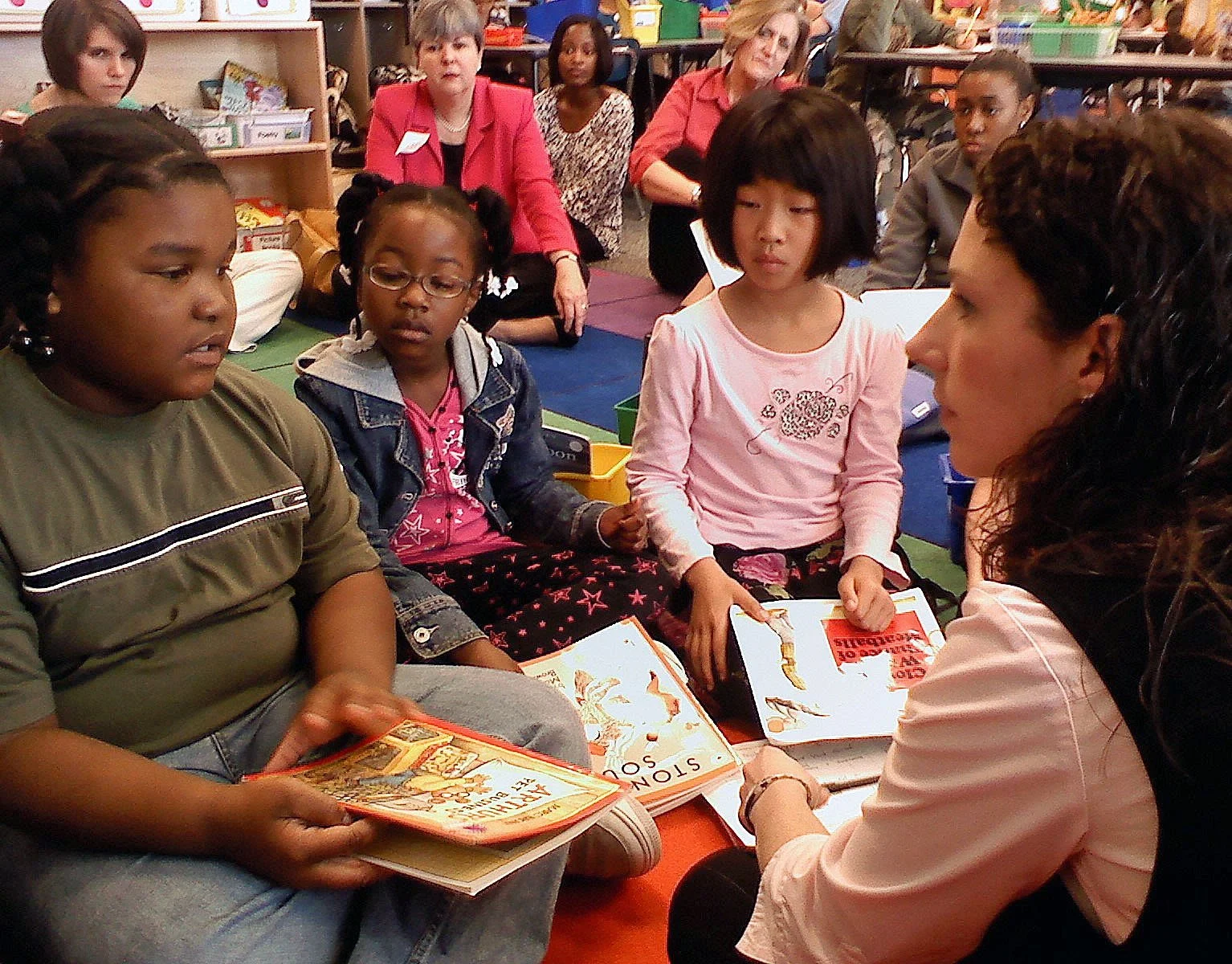 Guided reading supports students that are at or below the grade-level benchmark for the time of year. Teachers introduce students to characteristics of a variety of texts that are at their instructional reading level. A guided reading group is made up of students who are at/close to the same reading level. A common short text is chosen for each 10-15 minute session based on phonics needs, qualities of genres, behaviors and thinking work students will eventually need to tackle independently. Teachers provide a brief book introduction (1-2 minutes), considering vocabulary, content, and text structures. The book introduction helps students to read the book without major difficulty but still leaves some challenges. Teachers may provide a focus for the reading during the book introduction. Next, teachers listen in and coach as readers work through decoding and make meaning of the text. After students finish reading their guided reading text, teachers decide on a teaching point and word work based on observed needs as students read.